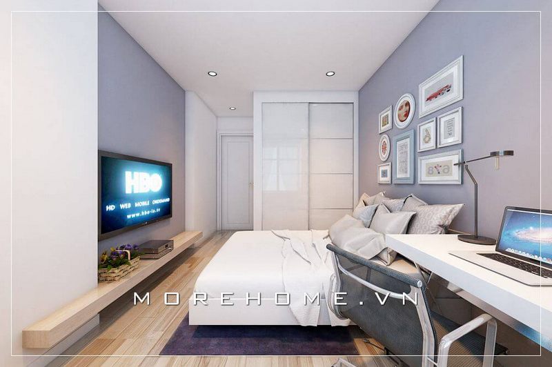 Gỗ công nghiệp là chất liệu xuyên suốt được sử dụng cho căn phòng ngủ nhà phố này. tủ quần áo gỗ acrylic của lùa giúp tiết kiệm thêm phần diện tích cho không gian phòng ngủ