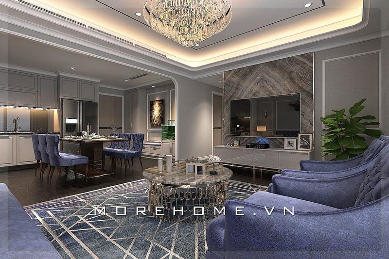 Bộ bàn ăn 6 ghế tân cổ điển sẽ là điểm nhấn ngăn cách hai không gian phòng khách liền bếp cho căn hộ chung cư