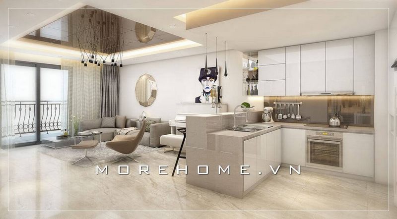 Cách thiết kế không gian phòng khách liền bếp cho căn hộ chung cư mang đến cảm giác không gian được nới rộng rất hữu hiệu.