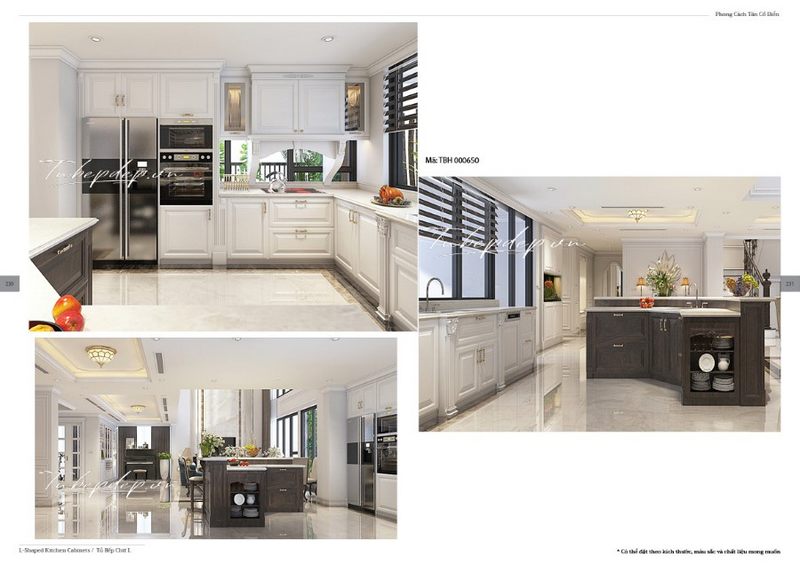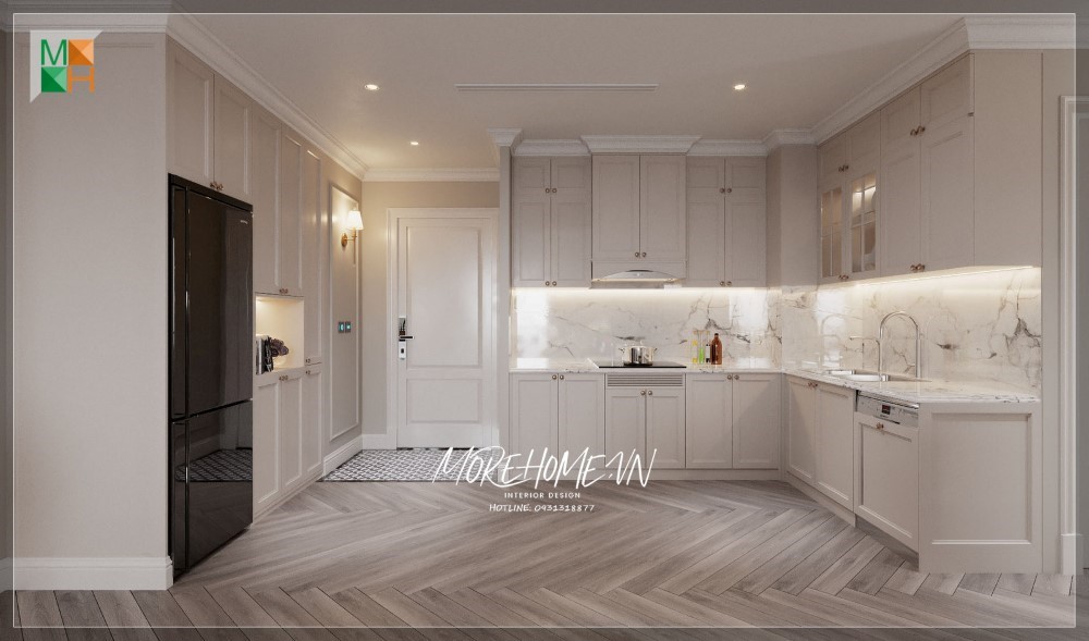 Để vừa mang lại sự tiện nghi, vừa thể hiện không gian sang trọng, đẳng cấp hãy chọn thiết kế phòng bếp màu trắng với nội thất tân cổ điển cho biệt thự, nhà phố của mình