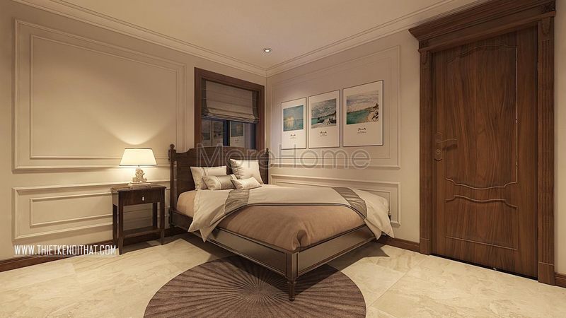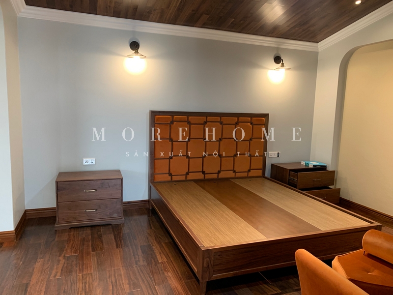 Giường ngủ biệt thự được làm từ chất liệu gỗ óc chó sang trọng, tiện nghi, phần chân thoải dạng thấp tạo nên độ thông thoáng cho căn phòng ngủ