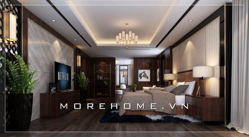 Nội thất phòng ngủ biệt thự cao cấp được bố trí vô cùng hợp lí, các đường nét hình khối giống nhau tạo nên cảm giác hài hòa, cân bằng cho cả không gian