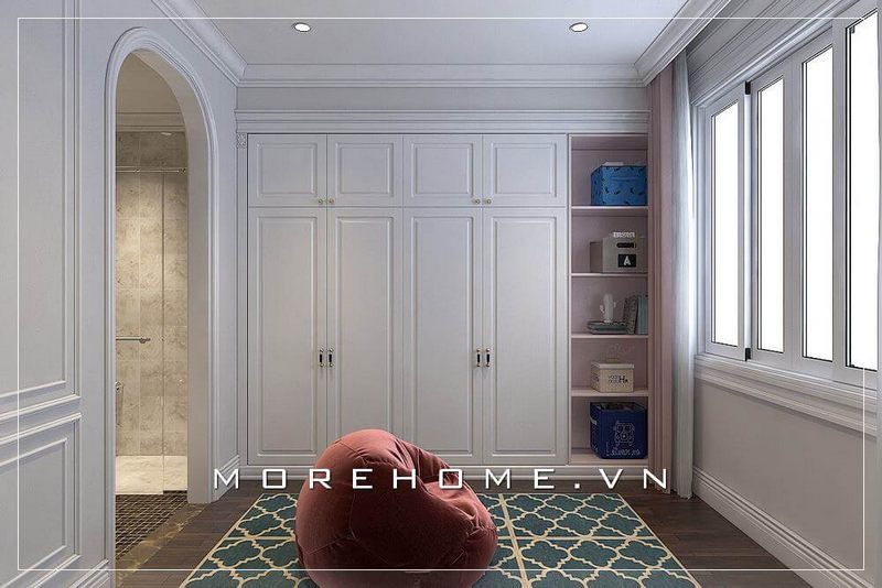 Tủ quần áo kết hợp kệ trang trí sơn trắng tay nắm đẹp, sang trọng cho phòng ngủ cho bé phong cách tân cổ điển