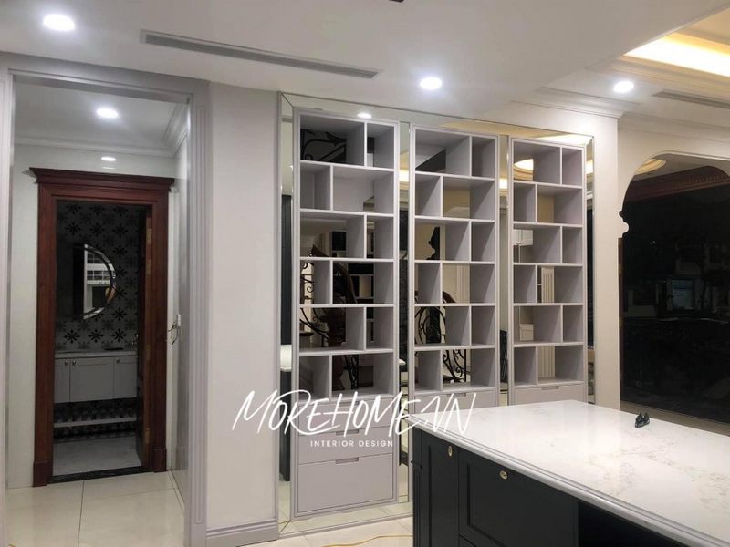 Mẫu kệ vách ngăn bằng gỗ công nghiệp giúp phân chia khu vực cầu thang và khu vực bếp kiểu dáng hiện đại đơn giản do Morehome sản xuất và lắp đặt