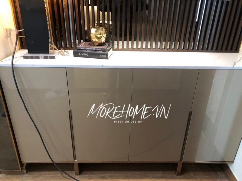 Hình ảnh thực tế mẫu kệ tủ bằng gỗ công nghiệp bóng gương acrylic kết hợp chân kệ inox và mặt kệ bằng đá nhân tạo cao cấp do Morehome sản xuất