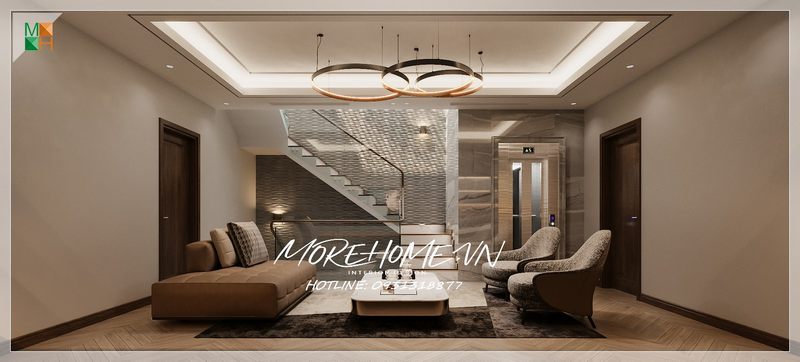 Với phong cách hiện đại, điều dễ dàng nhận thấy là tông màu trung tính như nâu, trắng, ghi chủ đạo ở phòng khách đã góp phần tạo cảm giác rộng rãi thoáng đãng.